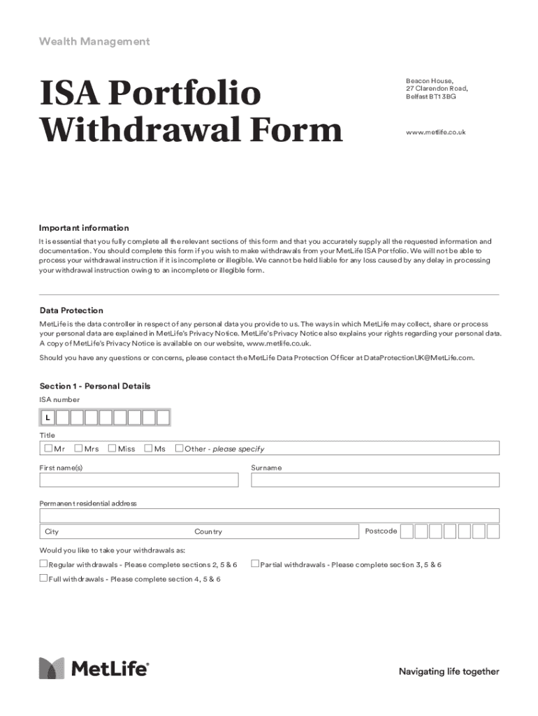 Wealth Management ISA Portfolio Withdrawal FormBeacon House, 27 Clarendon Road, Belfast BT1 3BGwww.MetLife.co.unimportant information It is essential that you fully complete all the relevant sections