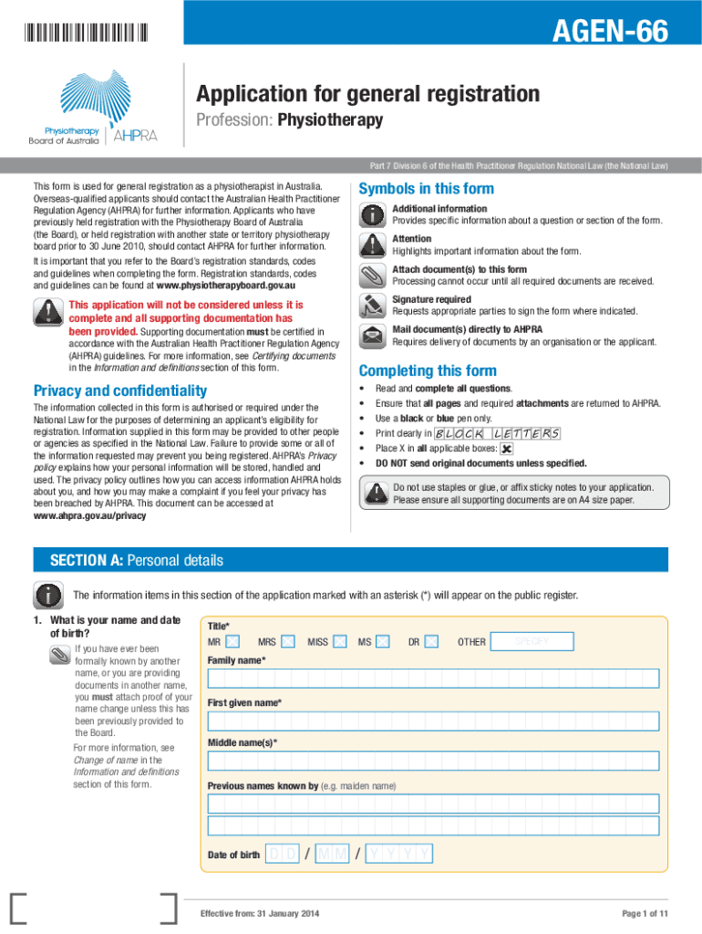 AGEN66* A GE N 6 6 1 * Application for general registration Profession: PhysiotherapyPart 7 Division 6 of the Health Practitioner Regulation National Law (the National Law)This form is used for general