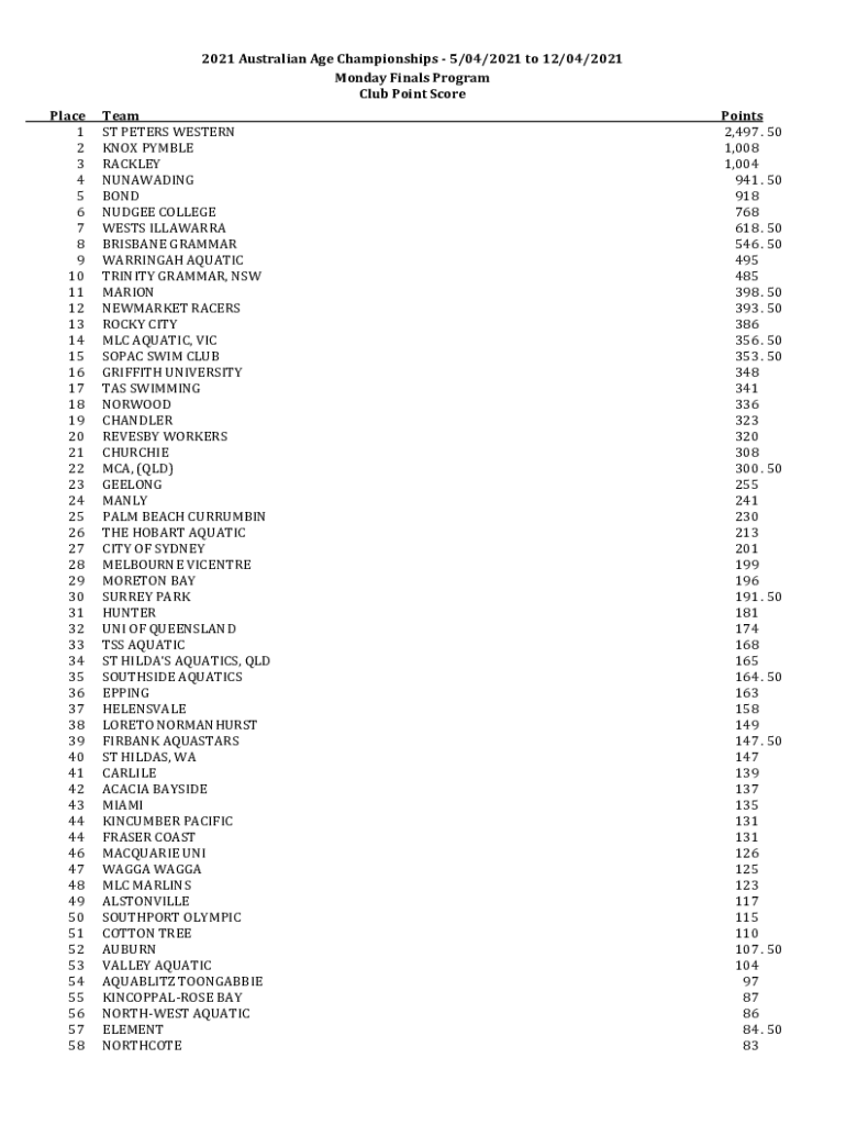 2021 Australian Age Championships 5/04/2021 to 12/04/2021 Monday Finals Program Club Point Score Place 1 2 3 4 5 6 7 8 9 10 11 12 13 14 15 16 17 18 19 20 21 22 23 24 25 26 27 28 29 30 31 32 33 34