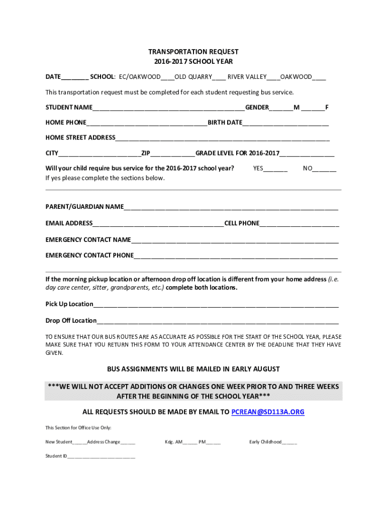 TRANSPORTATION REQUEST 20162017 SCHOOL YEAR DATE___ SCHOOL: EC/LAKEWOOD___OLD QUARRY___ RIVER VALLEY___OAKWOOD___ This transportation request must be completed for each student requesting bus service.
