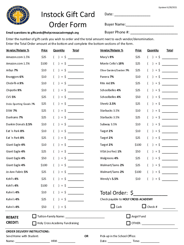 Updated 6/28/2021Instock Gift Card Order Format: ___ Buyer Name:___ Buyer Phone #: ___Email questions to giftcards@holycrossacademypgh.orgEnter the number of gift cards you wish to order and the total