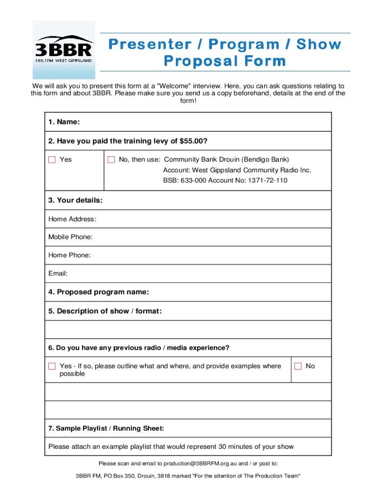 Presenter / Program / Show Proposal Form We will ask you to present this form at a \” Welcome\” interview. Here, you can ask questions relating to this form and about 3BBR. Please make sure you