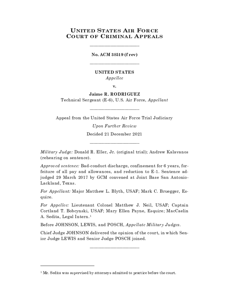 U NOTED S STATES AIR F ONCE C OUT OF C CRIMINAL APPEALS ___ No. ACM 38519 (f rev) ___ UNITED STATES Appealed v. Jaime R. RODRIGUEZ Technical Sergeant (E6), U.S. Air Force, Appellant ___ Appeal from