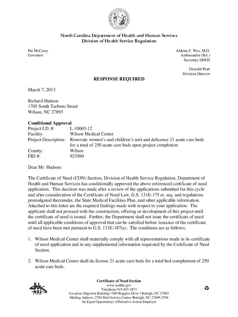 North Carolina Department of Health and Human Services Division of Health Service Regulation Pat McCrory GovernorAldona Z. Was, M.D. Ambassador (RET.) Secretary HHS DREAL Pratt Division DirectorRESPONSE