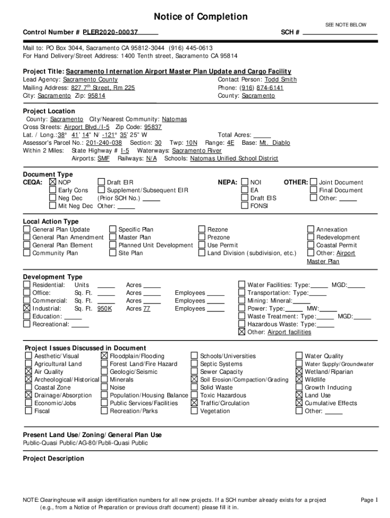Notice of Completion Control Number # PLER202000037SEE NOTE BELOW #Mail to: PO Box 3044, Sacramento CA 958123044 (916) 4450613 For Hand Delivery/Street Address: 1400 Tenth street, Sacramento CA 95814