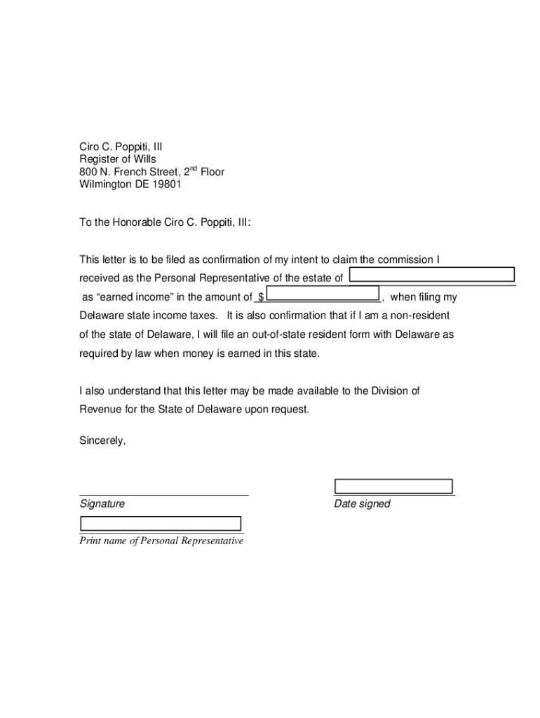 Cairo C. Popping, III Register of Wills 800 N. French Street, 2nd Floor Wilmington DE 19801To the Honorable Cairo C. Popping, III:This letter is to be filed as confirmation of my intent to claim the