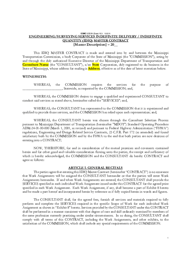 ESC 9/28/94 (Base) REV. 10/2018ENGINEERING/SURVEYING SERVICES INDEFINITE DELIVERY / INDEFINITE QUANTITY (ID IQ) MASTER CONTRACT Master Description 20__ This ID IQ MASTER CONTRACT is made and entered