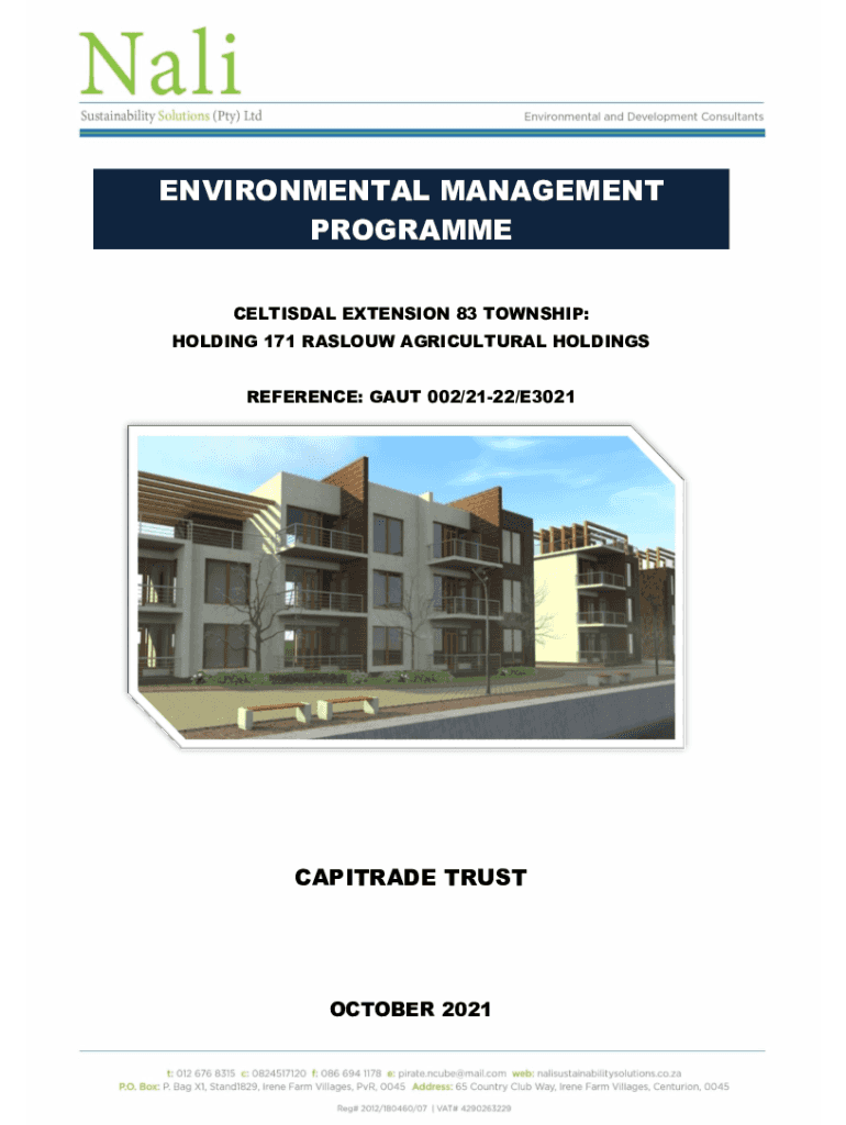 ENVIRONMENTAL MANAGEMENT Program CELTISDAL EXTENSION 83 TOWNSHIP: HOLDING 171 MASLOW AGRICULTURAL HOLDINGS REFERENCE: GAUL 002/2122/E3021CAPITRADE TRUSTOCTOBER 2021 Nazi Sustainability Solutions (Pty)