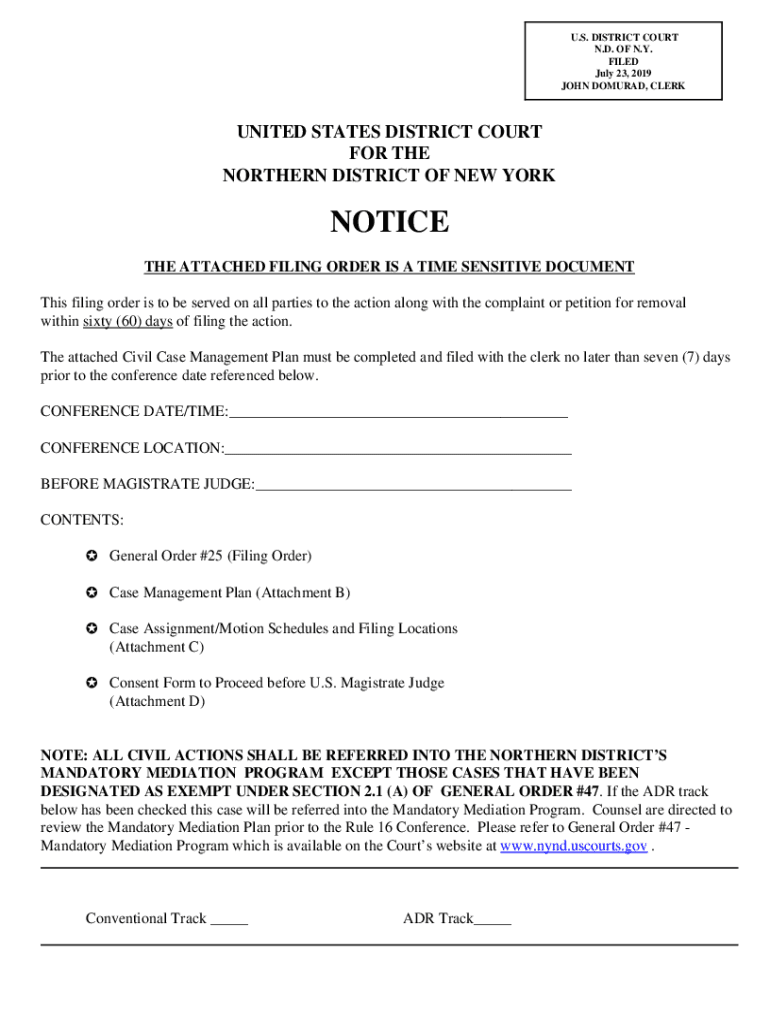 U.S. DISTRICT COURT N.D. OF N.Y. FILED July 23, 2019, JOHN TOURED, CLERKUNITED STATES DISTRICT COURT FOR THE NORTHERN DISTRICT OF NEW YORKNOTICE THE ATTACHED FILING ORDER IS A TIME SENSITIVE DOCUMENT