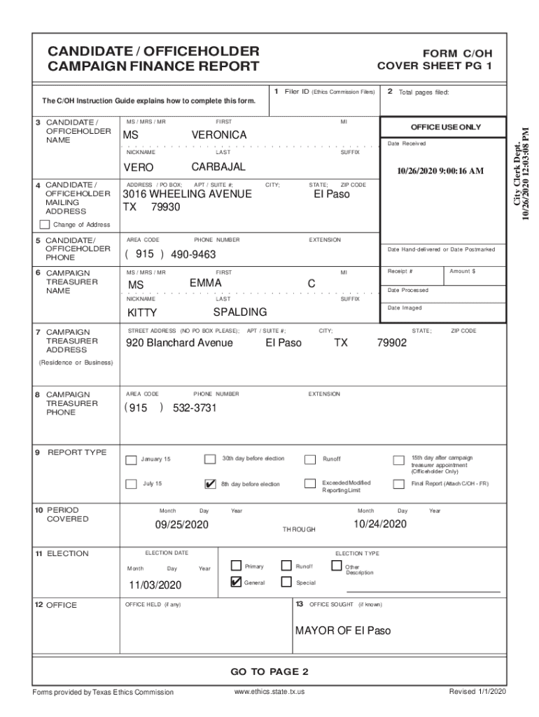 CANDIDATE / OFFICEHOLDER CAMPAIGN FINANCE REPORTER C/OH COVER SHEET PG 1 1 Filer ID2 Total pages filed:(Ethics Commission Filers)MS / MRS / MR3 CANDIDATE / OFFICEHOLDER NAMEFIRSTNICKNAMELASTDate ReceivedSUFFIXCARBAJALVERO