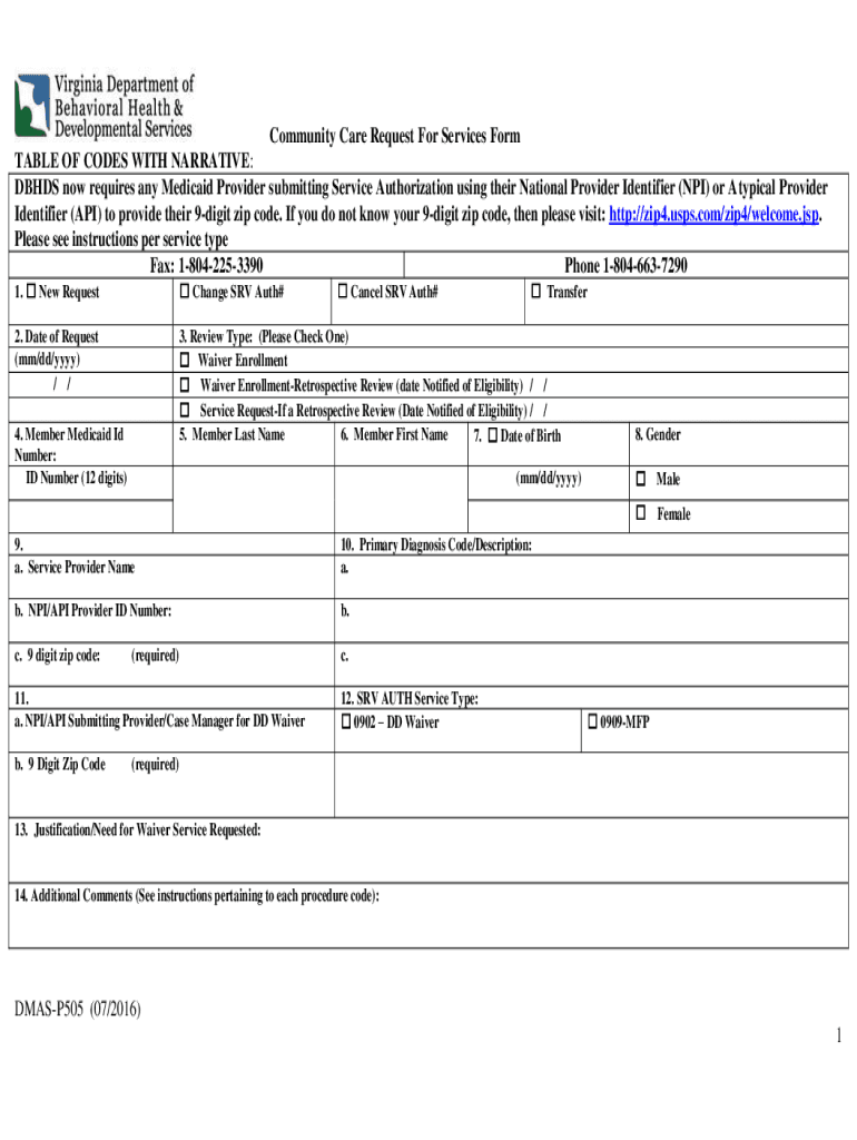 Community Care Request For Services Form TABLE OF CODES WITH NARRATIVE: DB HDS now requires any Medicaid Provider submitting Service Authorization using their National Provider Identifier (NPI) or