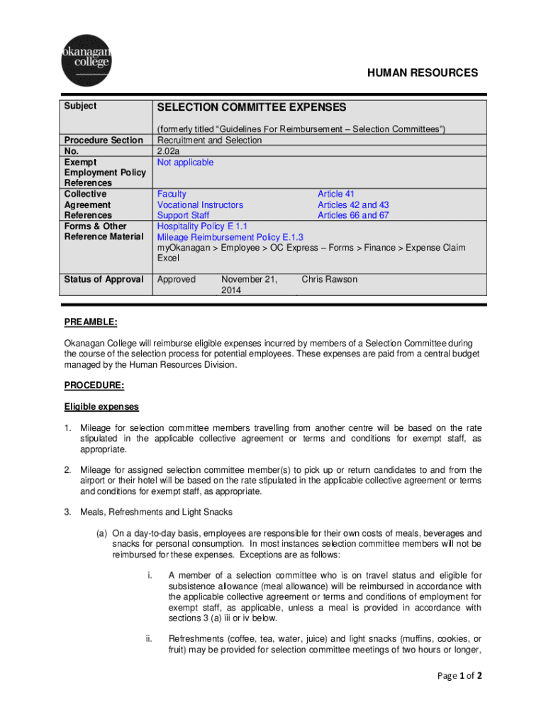 HUMAN RESOURCES SubjectSELECTION COMMITTEE EXPENSES (formerly titled Guidelines For Reimbursement Selection Committees) Recruitment and Selection 2.02a Not applicableProcedure Section No. Exempt Employment