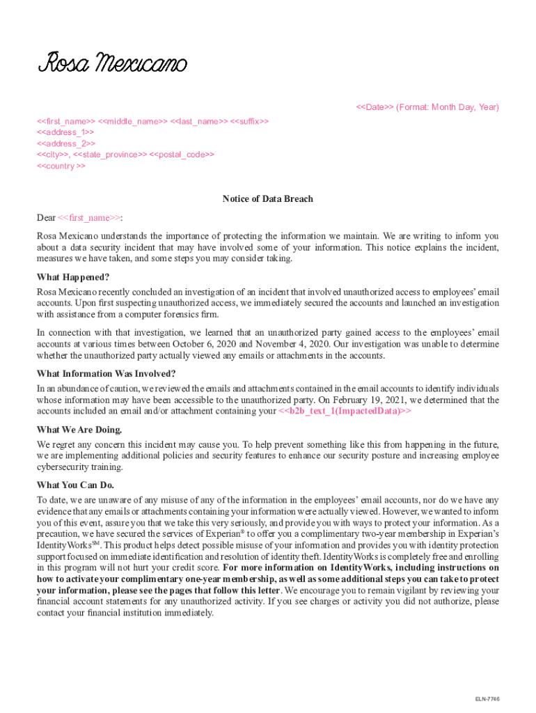 Date (Format: Month Day, Year) first_name middle_name last_name suffix address_1 address_2 city, state_province postal_code country Notice of Data Breach Dear first_name: Rosa Mexican understands