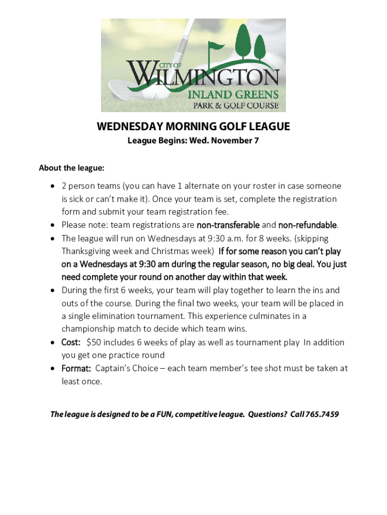 WEDNESDAY MORNING GOLF LEAGUE Begins: Wed. November 7 Abouttheleague: 2personteams(youcanhave1alternateonyourrosterincasesomeone issickorcantmakeit). Onceyourteamisset, completetheregistration formandsubmityourteamregistrationfee.
