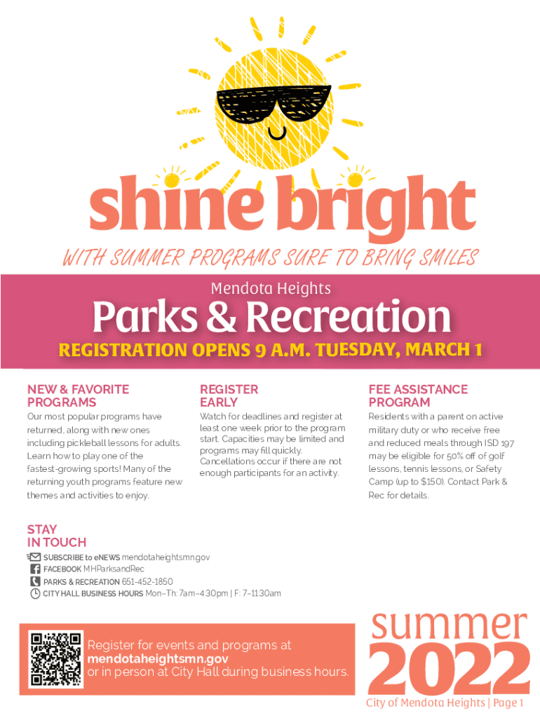 WITH SUMMER PROGRAMS SURE TO BRING SMILES Mendoza Heights Parks & RecreationREGISTRATION OPENS 9 A.M. TUESDAY, MARCH 1 NEW & FAVORITE PROGRAMSREGISTER EARLY ASSISTANCE Programmer most popular programs