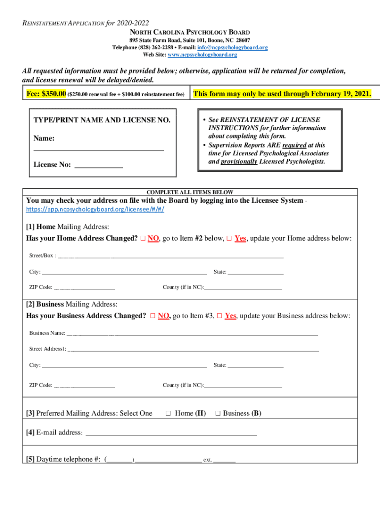 REINSTATEMENT APPLICATION for 20202022 NORTH CAROLINA PSYCHOLOGY BOARD 895 State Farm Road, Suite 101, Boone, NC 28607 Telephone (828) 2622258 Email: info@ncpsychologyboard.org Website: www.ncpsychologyboard.orgAll