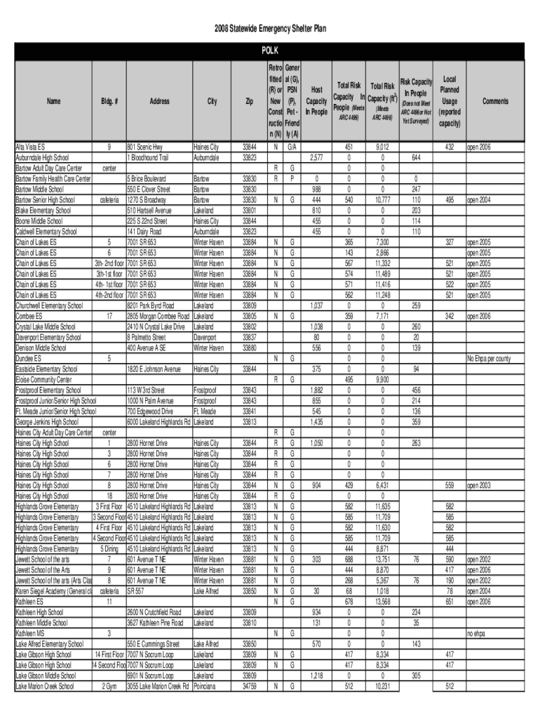 2008 Statewide Emergency Shelter Plan POLKNameBldg. #Address Alta Vista ES 801 Scenic Hwy 9 Auburn dale High School 1 Bloodhound Trail Barton Adult Day Care Center Barton Family Health Care Center