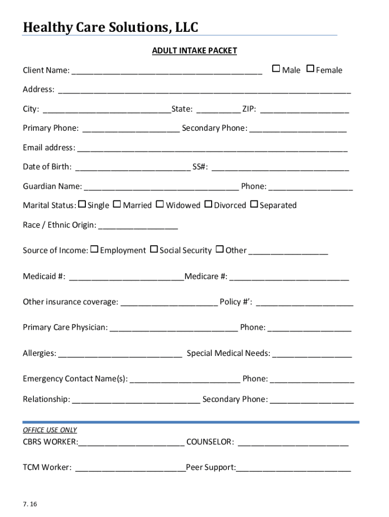 Healthy Care Solutions, LLC ADULT INTAKE PACKET Client Name: ___MaleFemaleAddress: ___ City: ___State: ___ ZIP: ___ Primary Phone: ___ Secondary Phone: ___ Email address: ___ Date of Birth: ___ SS#: