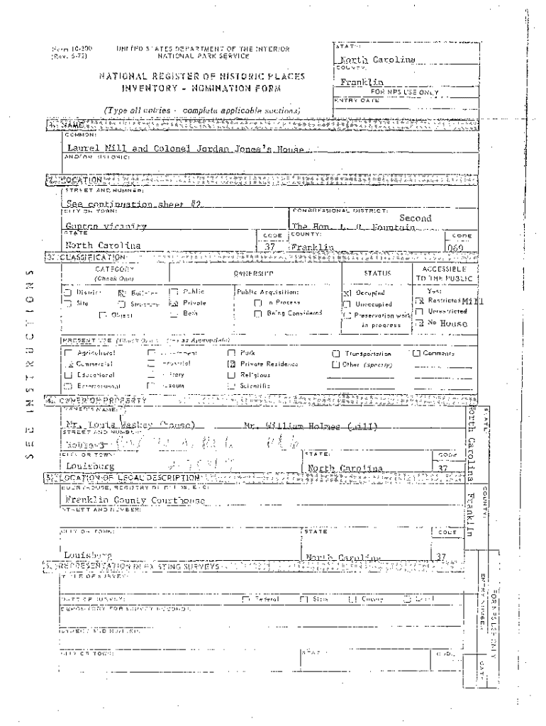 STATE:UNITED STATES DEPARTMENT OF THE INTERIOR NATIONAL PARK SE;RVICEFarm 10300 (Rev. 672)North Carolina COUNTY:R 0 INTO LACE NOMINATION FORMATION R GIINVENTORYFranklin FOR NPS USE ONLY ENTRY DATE(Type