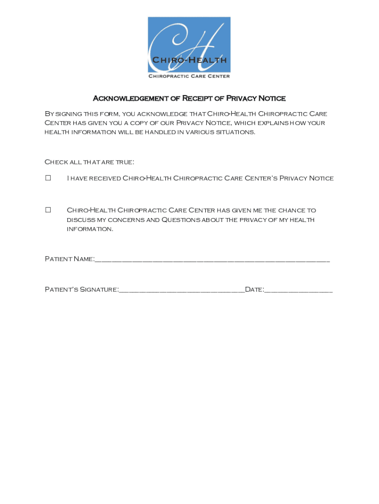 Acknowledgement of Receipt of Privacy Notice By signing this form, you acknowledge that ChiroHealth Chiropractic Care Center has given you a copy of our Privacy Notice, which explains how your health