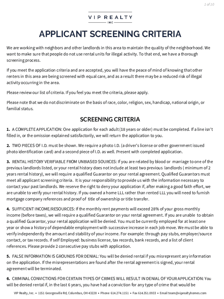 1 of 10APPLICANT SCREENING CRITERIA We are working with neighbors and other landlords in this area to maintain the quality of the neighborhood. We want to make sure that people do not use rental units