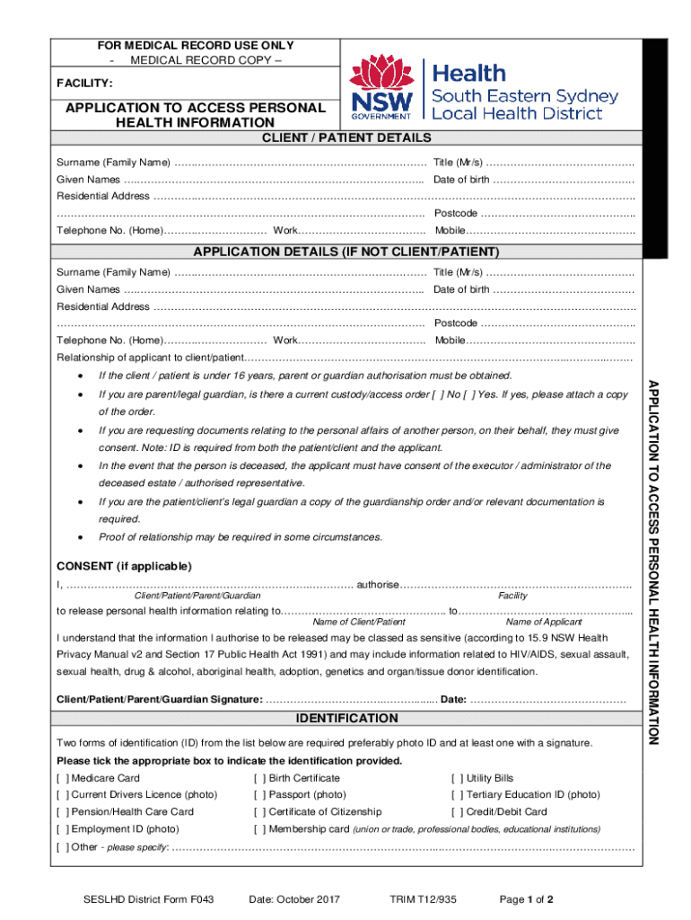 Get the free seslhd.health.nsw.gov.ausitesdefaultAPPLICATION TO ACCESS PERSONAL HEALTH INFORMATION