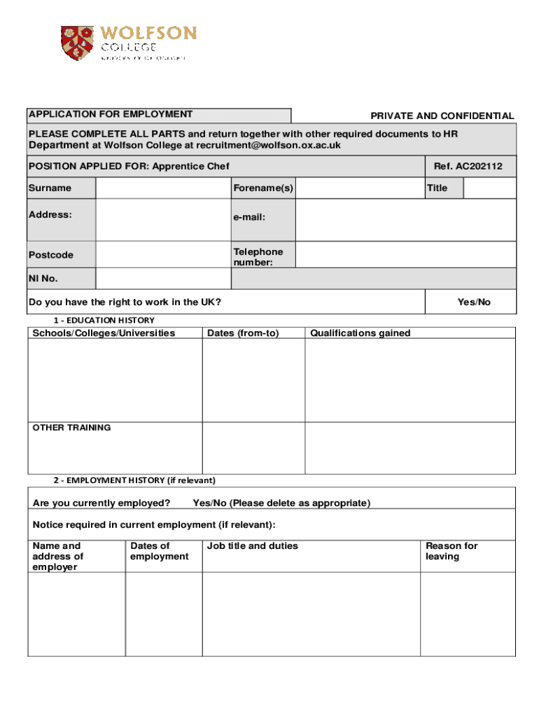 APPLICATION FOR EMPLOYMENTPRIVATE AND CONFIDENTIALPLEASE COMPLETE ALL PARTS and return together with other required documents to HR Department at Wolf son College at recruitment@wolfson.ox.ac.uk POSITION