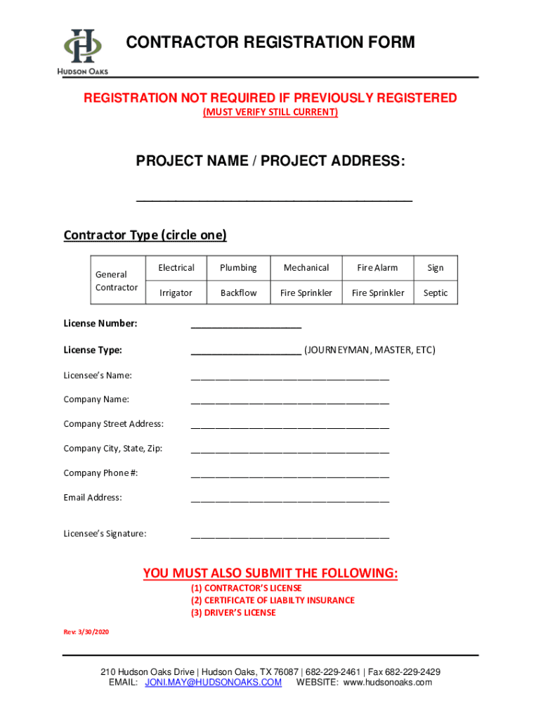 CONTRACTOR REGISTRATION PREREGISTRATION NOT REQUIRED IF PREVIOUSLY REGISTERED (MUST VERIFY STILL CURRENT)PROJECT NAME / PROJECT ADDRESS: ___ Contractor Type (circle one) General ContractorElectricalPlumbingMechanicalFire