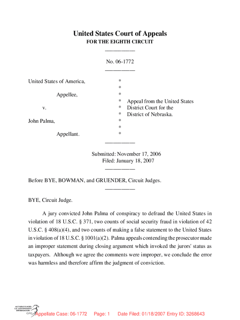 United States Court of Appeals FOR THE EIGHTH CIRCUIT___ No. 061772 ___ United States of America, Appealed, v. John Palma, Appellant.* * * * Appeal from the United States * District Court for the