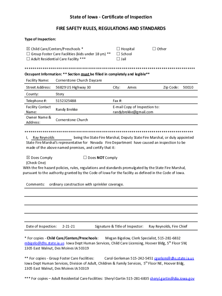 State of Iowa Certificate of Inspection FIRE SAFETY RULES, REGULATIONS AND STANDARDS Type of Inspection: Child Care/Centers/Preschools * Group Foster Care Facilities (kids under 18 yrs) ** Adult Residential