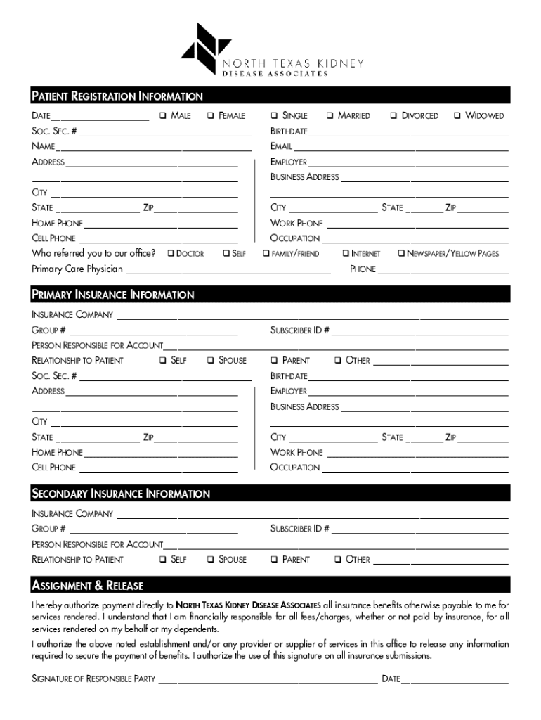 PATIENT REGISTRATION INFORMATION DATE ___ MALE FEMALE SINGLE MARRIED DIVORCED WIDOWED SOC. SEC. # ___BIRTHDATE ___NAME ___EMAIL ___ADDRESS ___EMPLOYER ______BUSINESS ADDRESS ___CITY ______STATE ___