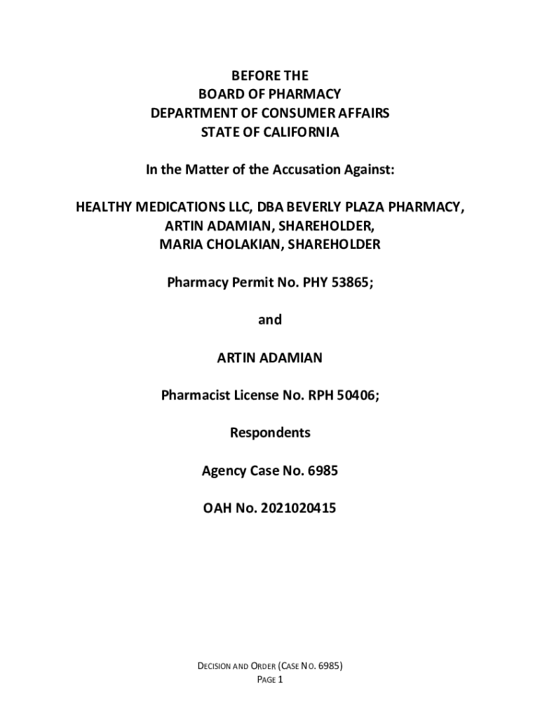 BEFORE THE BOARD OF PHARMACY DEPARTMENT OF CONSUMER AFFAIRS STATE OF CALIFORNIA In the Matter of the Accusation Against: HEALTHY MEDICATIONS LLC, DBA BEVERLY PLAZA PHARMACY, MARTIN DAMIAN, SHAREHOLDER,