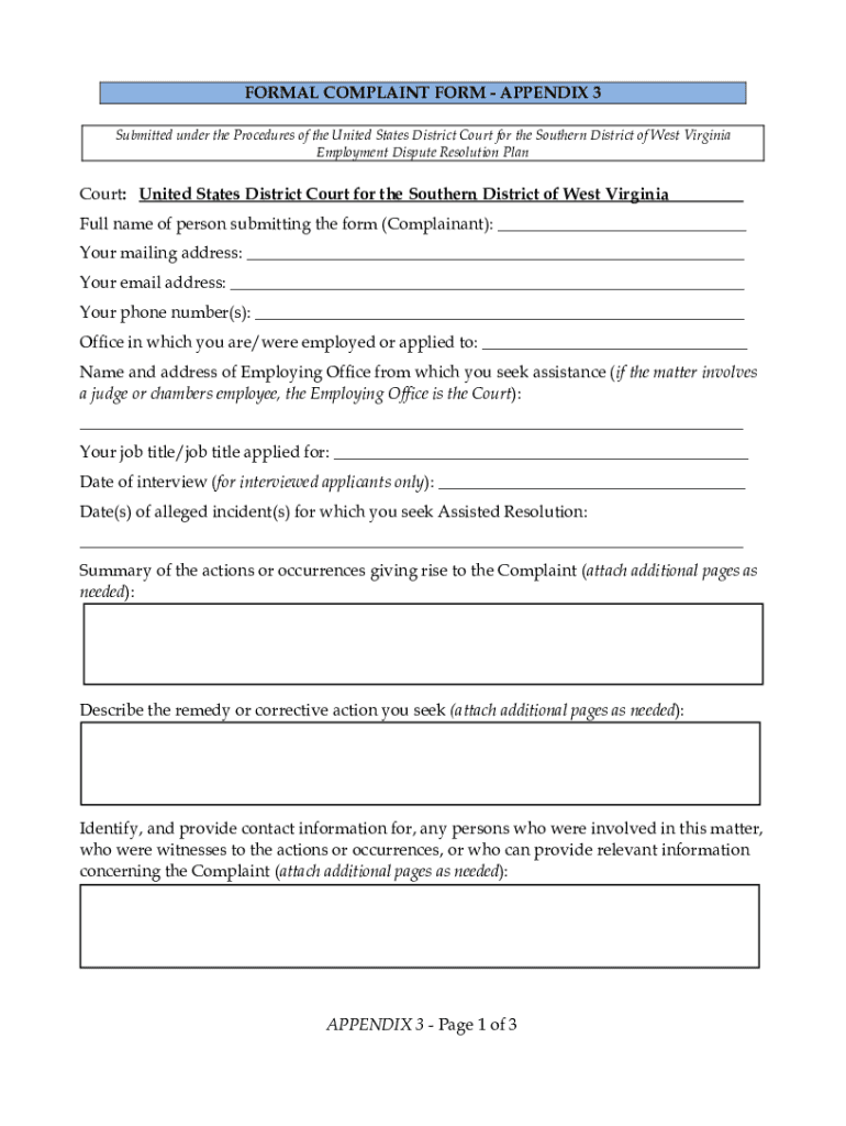 FORMAL COMPLAINT FORM APPENDIX 3 Submitted under the Procedures of the United States District Court for the Southern District of West Virginia Employment Dispute Resolution Agincourt: United States