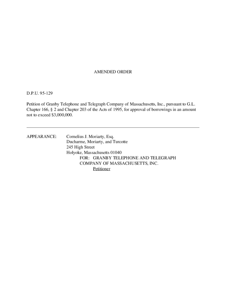 AMENDED ORDER. P.U. 95129 Petition of Granby Telephone and Telegraph Company of Massachusetts, Inc., pursuant to G.L. Chapter 166, 2 and Chapter 203 of the Acts of 1995, for approval of borrowings