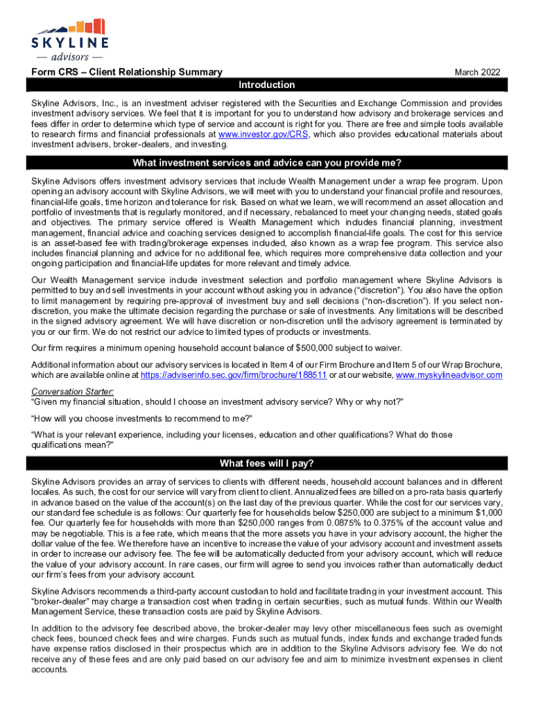Form CRS Client Relationship SummaryIntroductionMarch 2022Skyline Advisors, Inc., is an investment advisor registered with the Securities and Exchange Commission and provides investment advisory services.