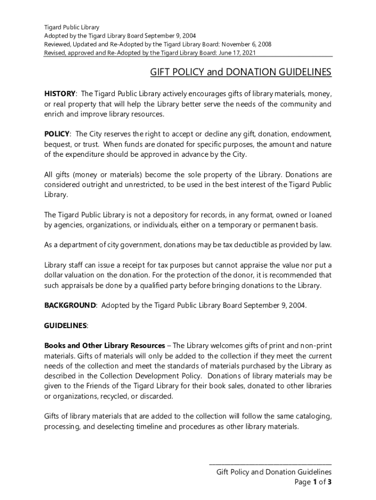 Get the free www.tigard-or.govhomeshowpublisheddocumentGIFT POLICY and DONATION GUIDELINES - Tiga...