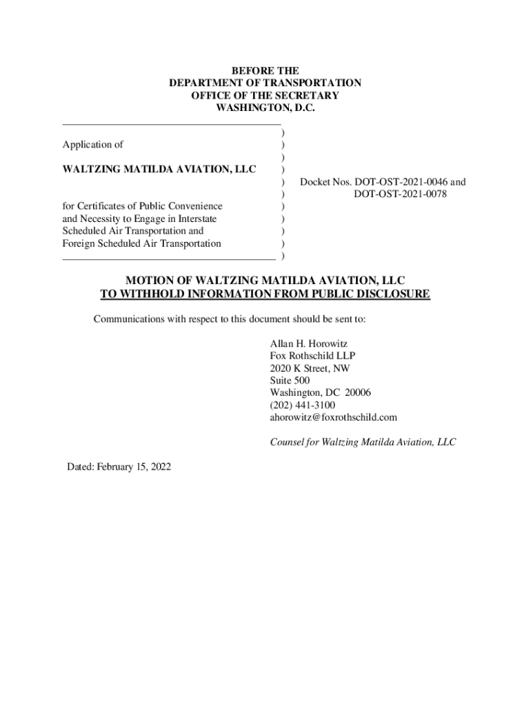 BEFORE THE DEPARTMENT OF TRANSPORTATION OFFICE OF THE SECRETARY WASHINGTON, D.C. ___) Application of)) WALTZING MATILDA AVIATION, LLC)) Docket Nos. DOTOST20210046 and) DOTOST20210078 for Certificates