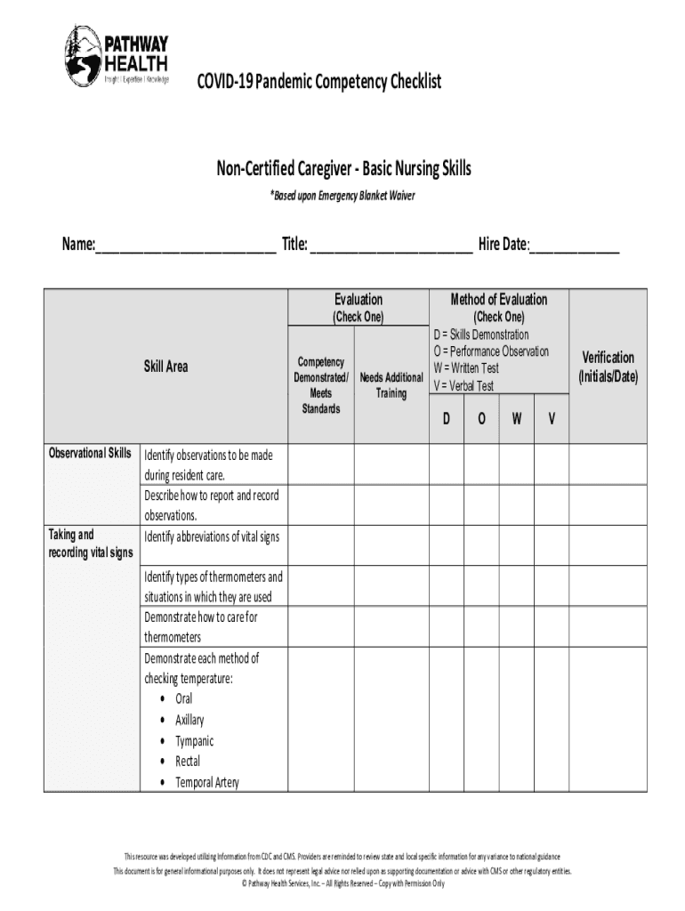 COVID-19 Pandemic Competency Checklist Uncertified Caregiver Basic Nursing Skills *Based upon Emergency Blanket Advergame:___ Title: ___ Hire Date:___ Evaluation(Check One)Skill AreaObservational