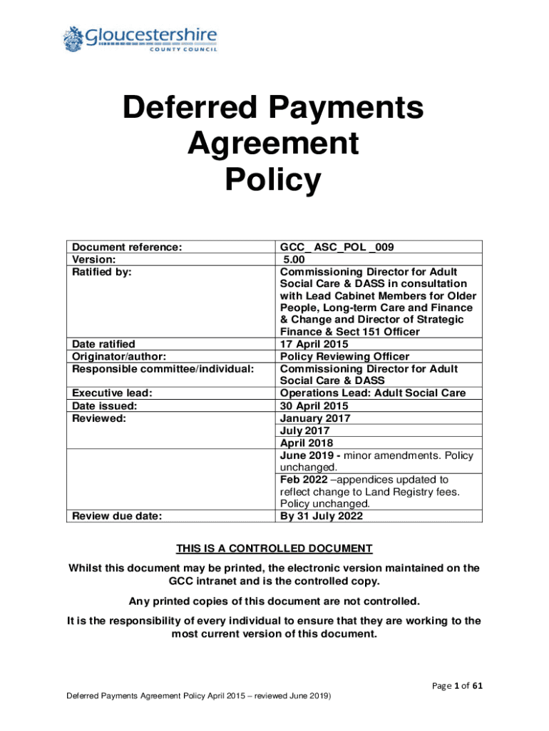 Deferred Payments Agreement Policy Document reference: Version: Ratified by:Date ratified Originator/author: Responsible committee/individual: Executive lead: Date issued: Reviewed:Review due date:GCC_