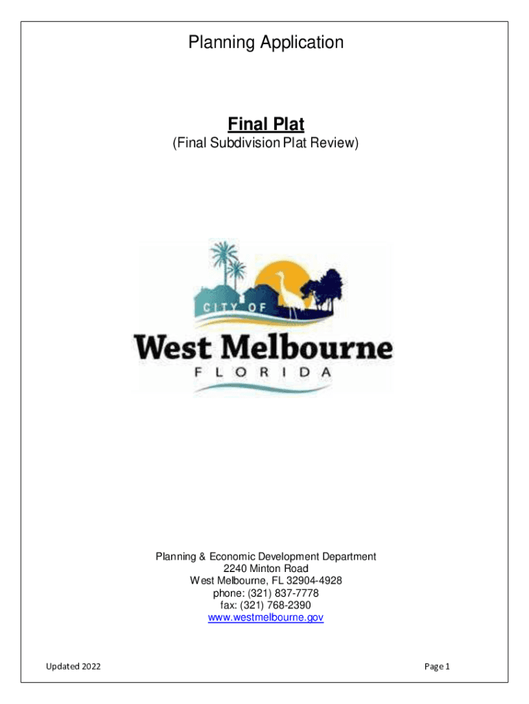 Planning ApplicationFinal Plat (Final Subdivision Plat Review)Planning & Economic Development Department 2240 Minton Road West Melbourne, FL 329044928 phone: (321) 8377778 fax: (321) 7682390 www.westmelbourne.govUpdated