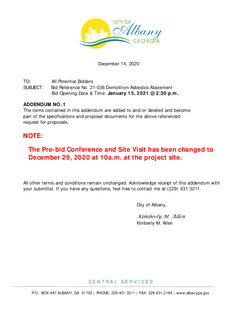 December 14, 2020, TO: SUBJECT:All Potential Bidders Bid Reference No. 21036 Demolition/Asbestos Abatement Bid Opening Date & Time: January 15, 2021 @ 2:30 p.m.ADDENDUM NO. 1 The items contained in