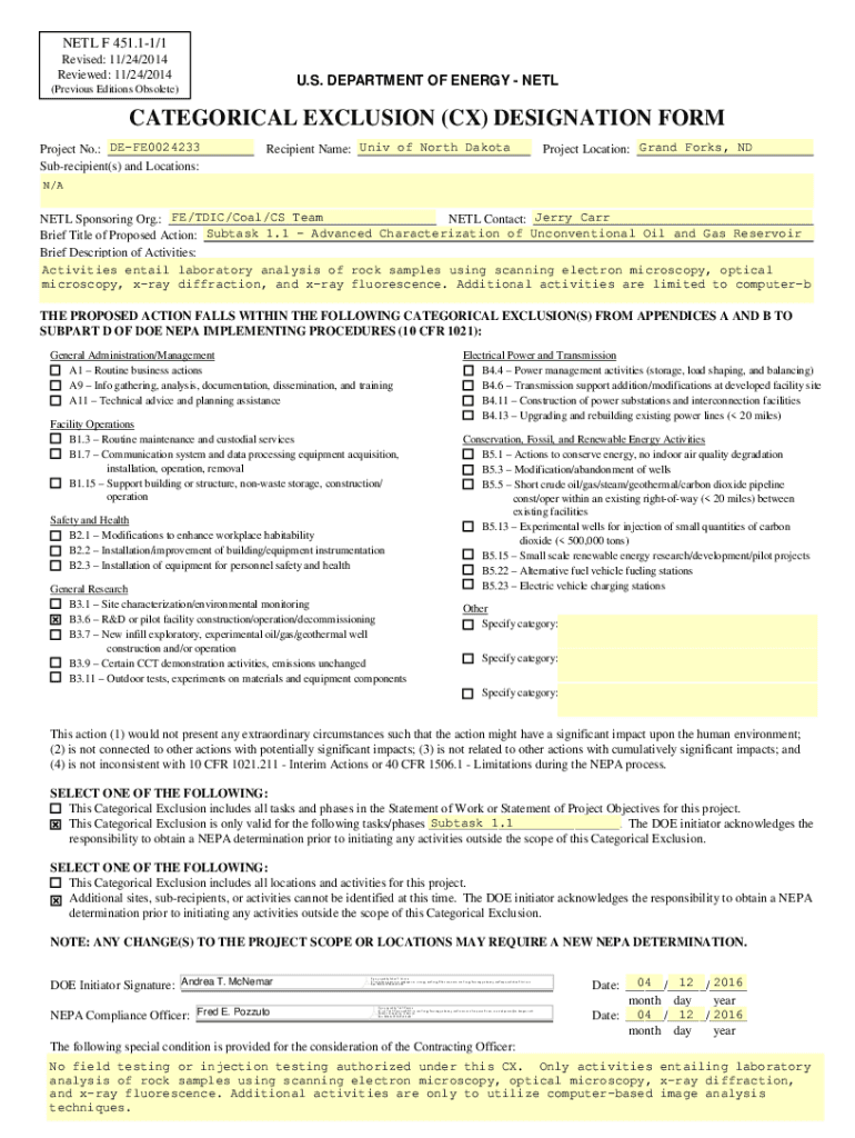 NET F 451.11/1 Revised: 11/24/2014 Reviewed: 11/24/2014U. S. DEPARTMENT OF ENERGY NET(Previous Editions Obsolete)CATEGORICAL EXCLUSION (CX) DESIGNATION FORM Project No.: DEFE0024233 Subrecipient(s)