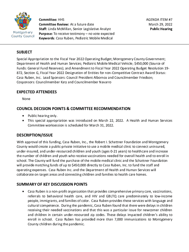 Montgomery County CouncilCommittee: HHS Committee Review: At a future date Staff: Linda McMillan, Senior Legislative Analyst Purpose: To receive testimony no vote expected Keywords: Casey Ruben, Pediatric