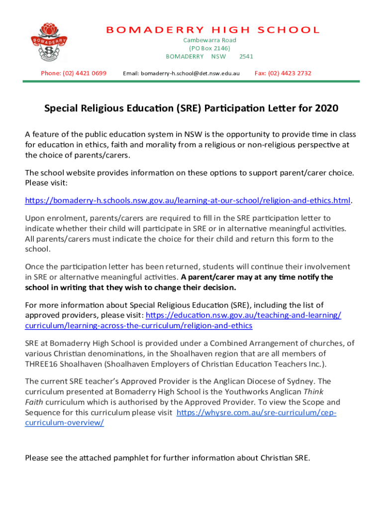 Canberra Road (PO Box 2146) COMRADERY NSW 2541 Phone: (02) 4421 0699Email: bomaderryh.school@det.nsw.edu.auFax: (02) 4423 2732Special Religious Education (SRE) Participation Letter for 2020 A feature