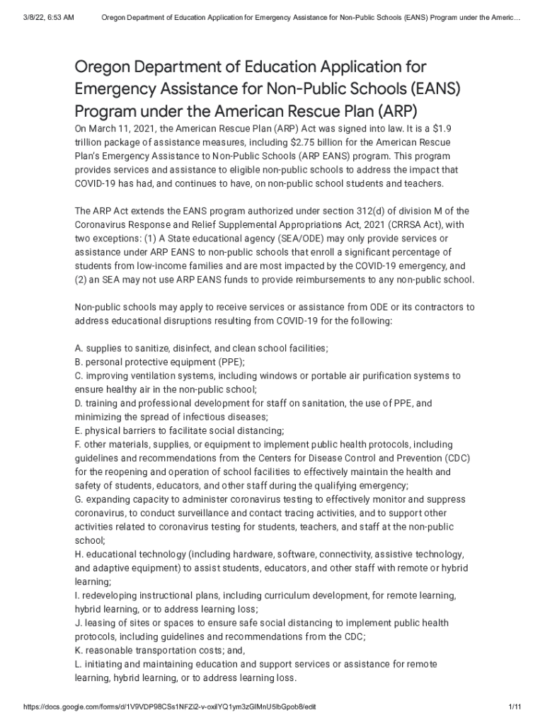3/8/22, 6:53 AM Oregon Department of Education Application for Emergency Assistance for Nonpublic Schools (FANS) Program under the AmericOregon Department of Education Application for Emergency Assistance