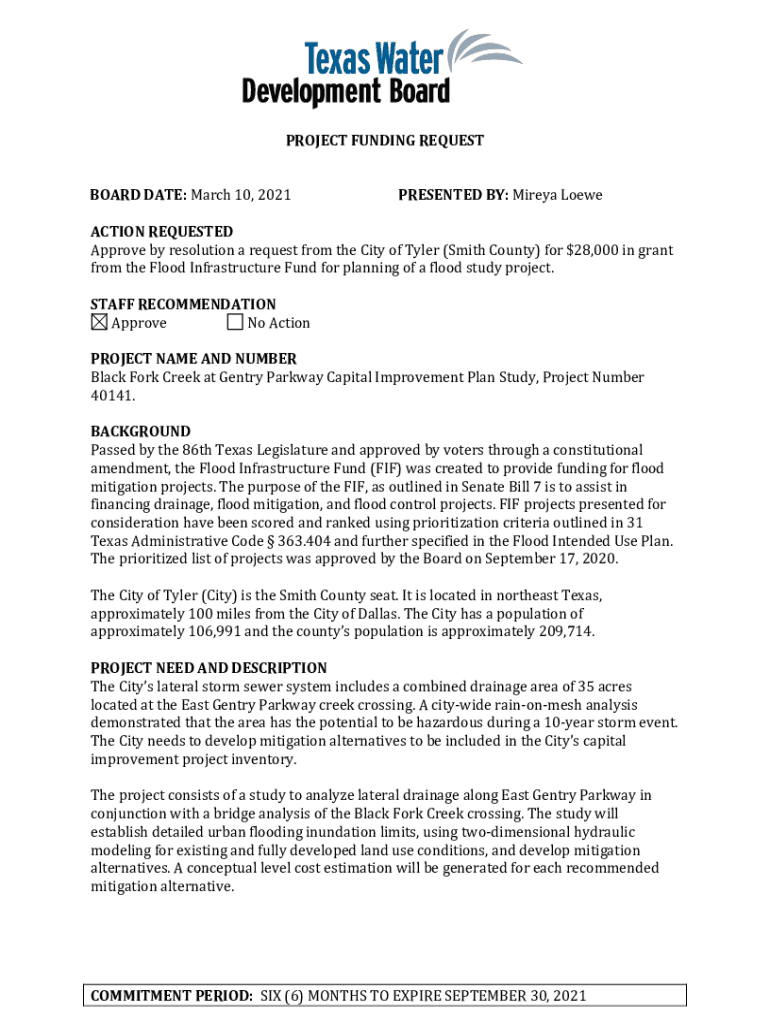 PROJECT FUNDING REQUEST BOARD DATE: March 10, 2021PRESENTED BY: Mire ya LoeweACTION REQUESTED Approve by resolution a request from the City of Tyler (Smith County) for $28,000 in grant from the Flood