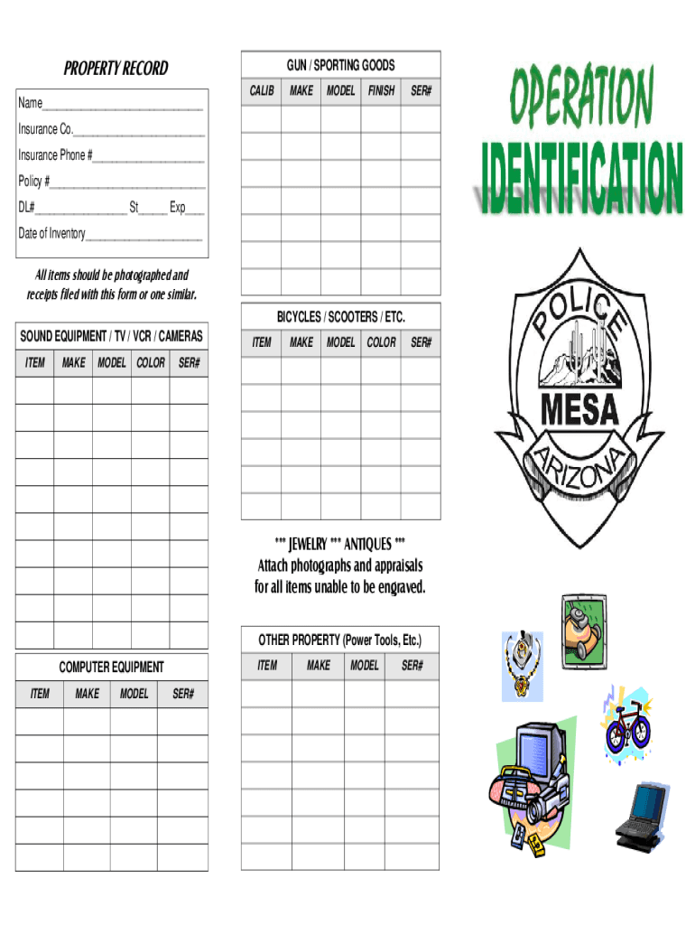 PROPERTY RECORD / SPORTING GOODSName___CALIBMAKEMODELFINISHSER#Insurance Co.___ Insurance Phone #___ Policy #___ DL#___ St___ Exp___ Date of Inventory___All items should be photographed and receipts