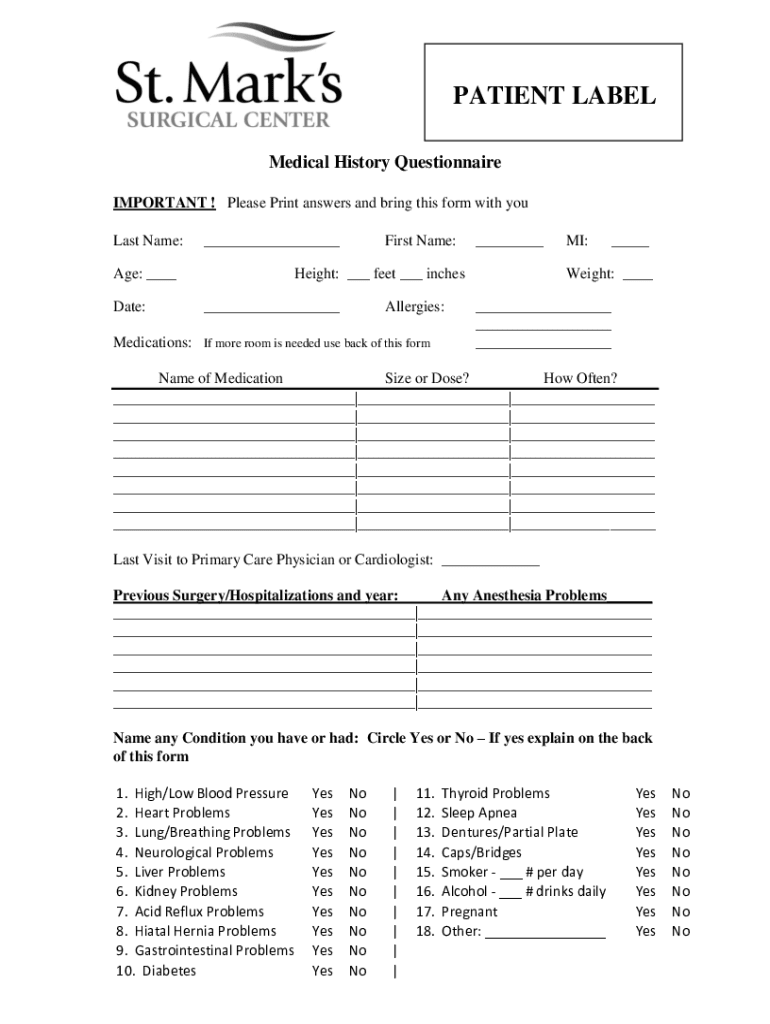 PATIENT LABEL Medical History Questionnaire IMPORTANT ! Please Print answers and bring this form with you Last Name:___Age: ___ Date:First Name:___Height: ___ feet ___ inches ___Allergies:Medications: