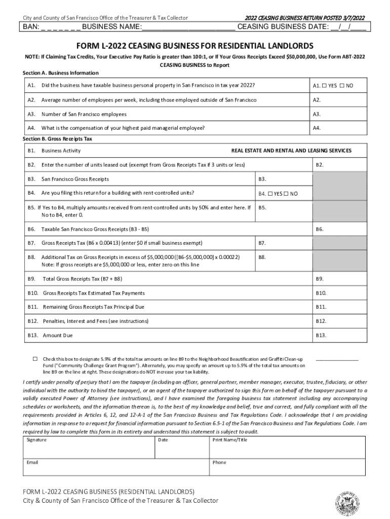 2022 CEASING BUSINESS RETURN POSTED 3/7/2022City and County of San Francisco Office of the Treasurer & Tax Collector: _ _ _ _ _ _ _ BUSINESS NAME:___ CEASING BUSINESS DATE: __/__/___FORM L2022 CEASING