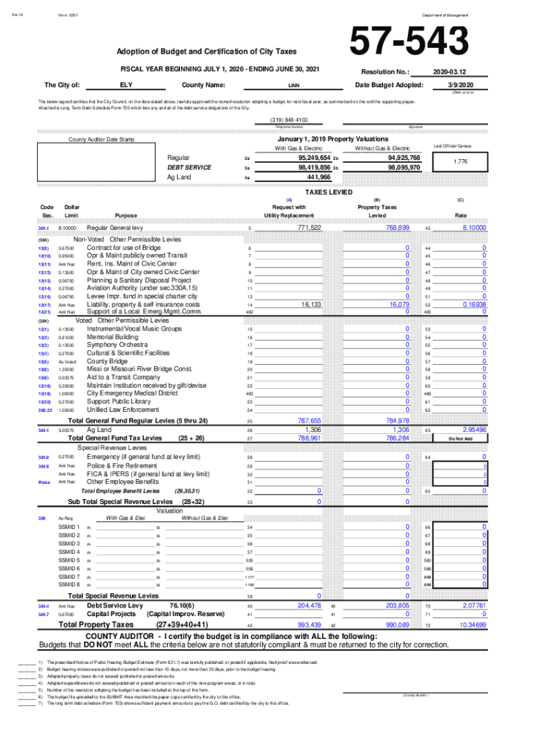 Dec18Form 635.1Department of Management157543Adoption of Budget and Certification of City Taxes FISCAL YEAR BEGINNING JULY 1, 2020, ENDING JUNE 30, 2021, The City of:County Name:Resolution No.:202003.12Date